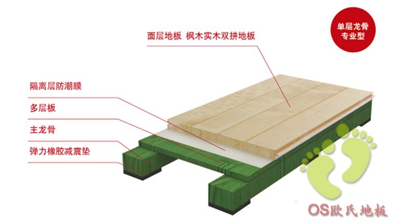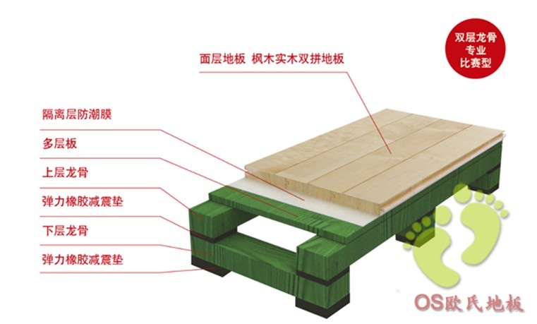 雙層龍骨結(jié)構(gòu)是體育木地板中一種懸浮式木地板結(jié)構(gòu),它不但堅(jiān)固耐用而且彈性十足,運(yùn)動性能完全滿足DIN標(biāo)準(zhǔn)的要求。提供出色的彈性而且具備有效的減震功能,地板結(jié)構(gòu)性能比較均勻,滿足用戶對地板各項(xiàng)性能、外觀和耐久性的要求,該系統(tǒng)擁有**的振動吸收,具有空前絕佳的運(yùn)動性能,符合所有訓(xùn)練或者體育比賽的要求。